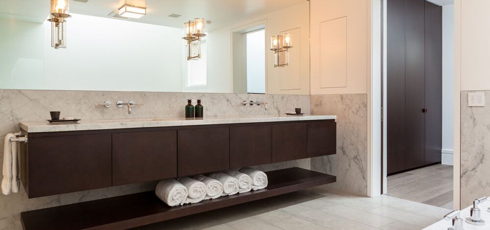 Masterful Master Bath Extra-long floating vanity of ebonized oak provides contrast in this master bath.